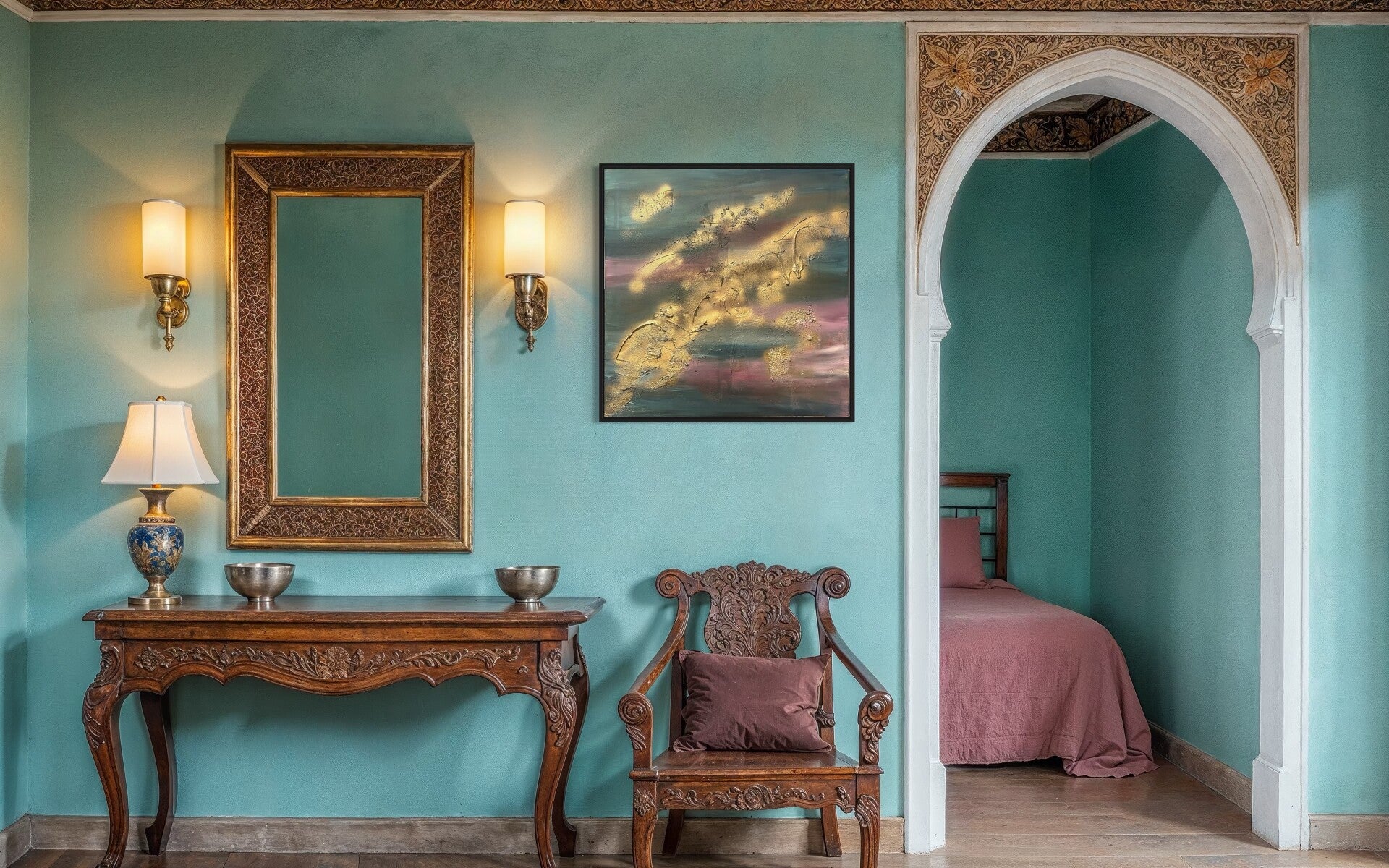 Ich habe mit feinen Lasuren und Schichttechniken gearbeitet, die an klassische Fresken erinnern, aber mit modernen Pigmenten umgesetzt. Gold ist für mich kein Schmuck, sondern eine Farbe der Stille und Kraft.